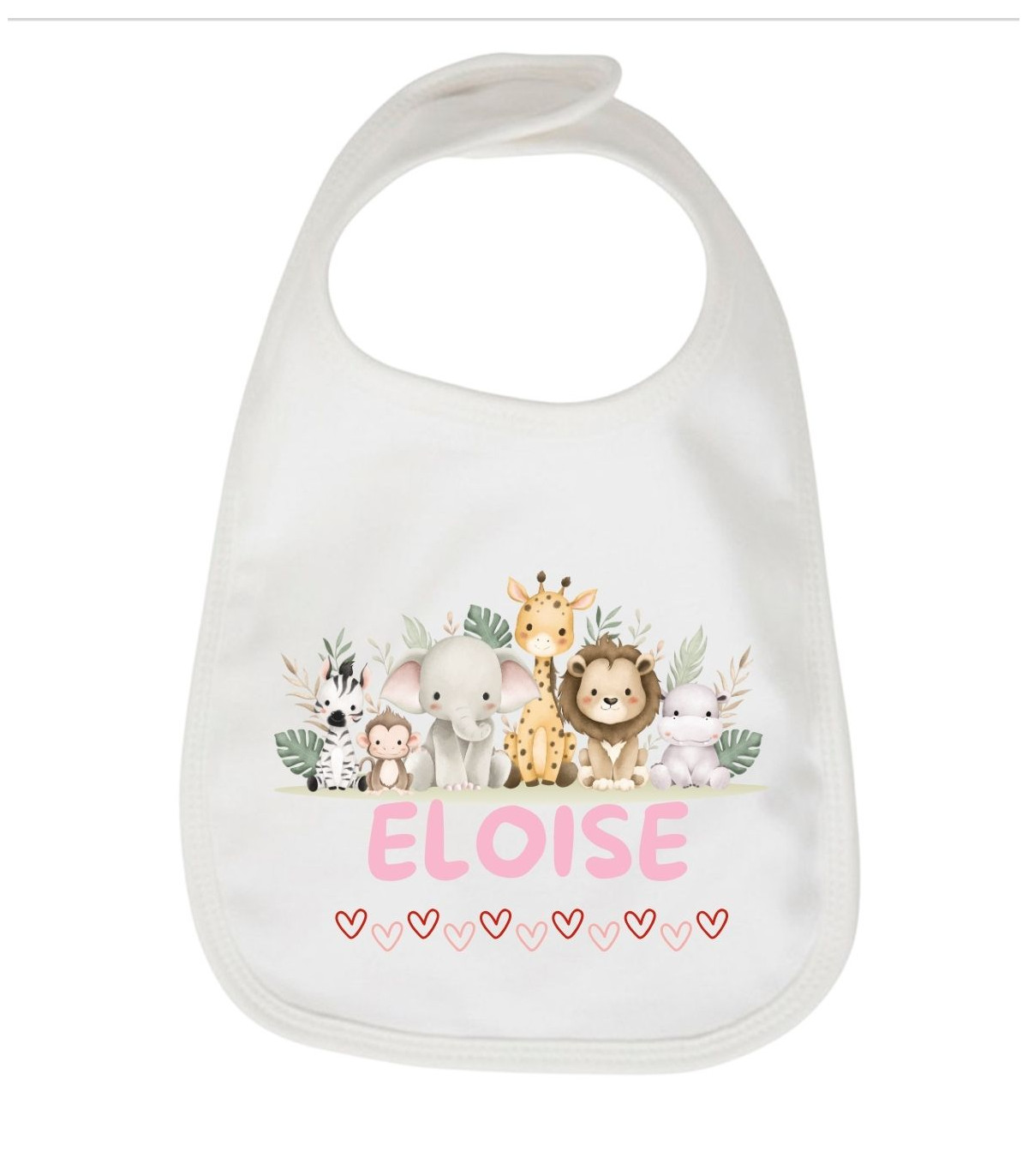 Offrez à votre bébé un accessoire unique avec ce bavoir personnalisé à son prénom. Illustré de tendres animaux de la savane façon aquarelle, il combine élégance et utilité pour faire de chaque repas un moment spécial.
