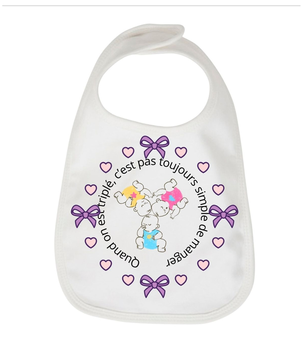 Avoir des triplés, c'est trois fois plus d'amour, mais c'est aussi une organisation millimétrée, surtout à l'heure du déjeuner. Notre lot de 3 bavoirs "Quand on est triplé, c'est pas toujours simple de manger" a été spécialement conçu pour dédramatiser ces moments sportifs avec tendresse et dérision. Arborant un design craquant avec trois petits personnages entourés de cœurs et de nœuds violets, ces bavoirs célèbrent votre joyeuse tribu.