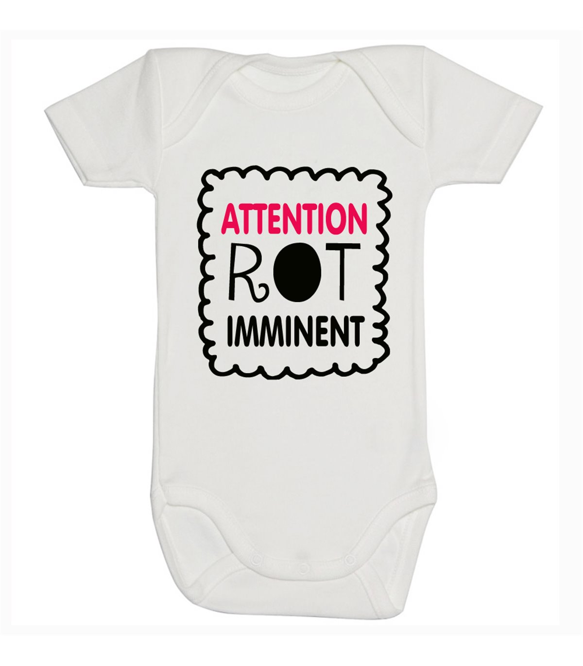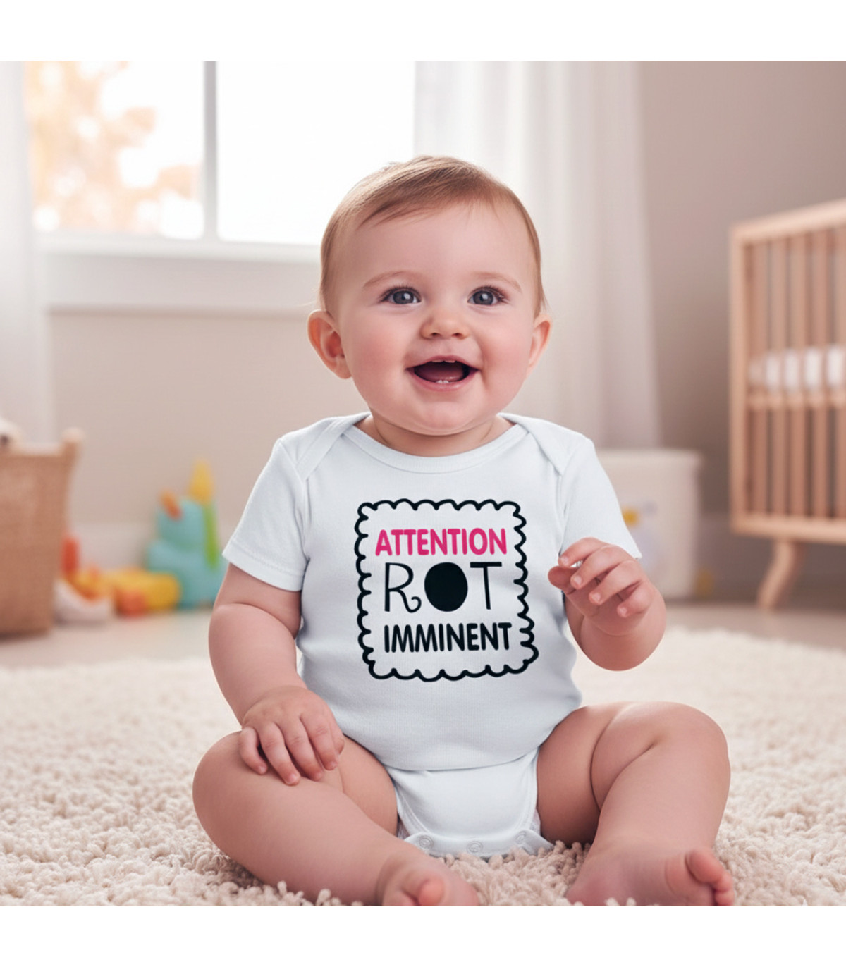 Parce que la vie avec un nouveau-né est faite de moments imprévisibles, notre body "Attention Rot Imminent" est là pour prévenir les plus téméraires. Avec son design moderne en forme de petit cadre festonné et son message percutant, il transforme un petit "incident" physiologique en un véritable instant de rire partagé. Fini le stress des après-repas, affichez l'alerte avec style et dérision !