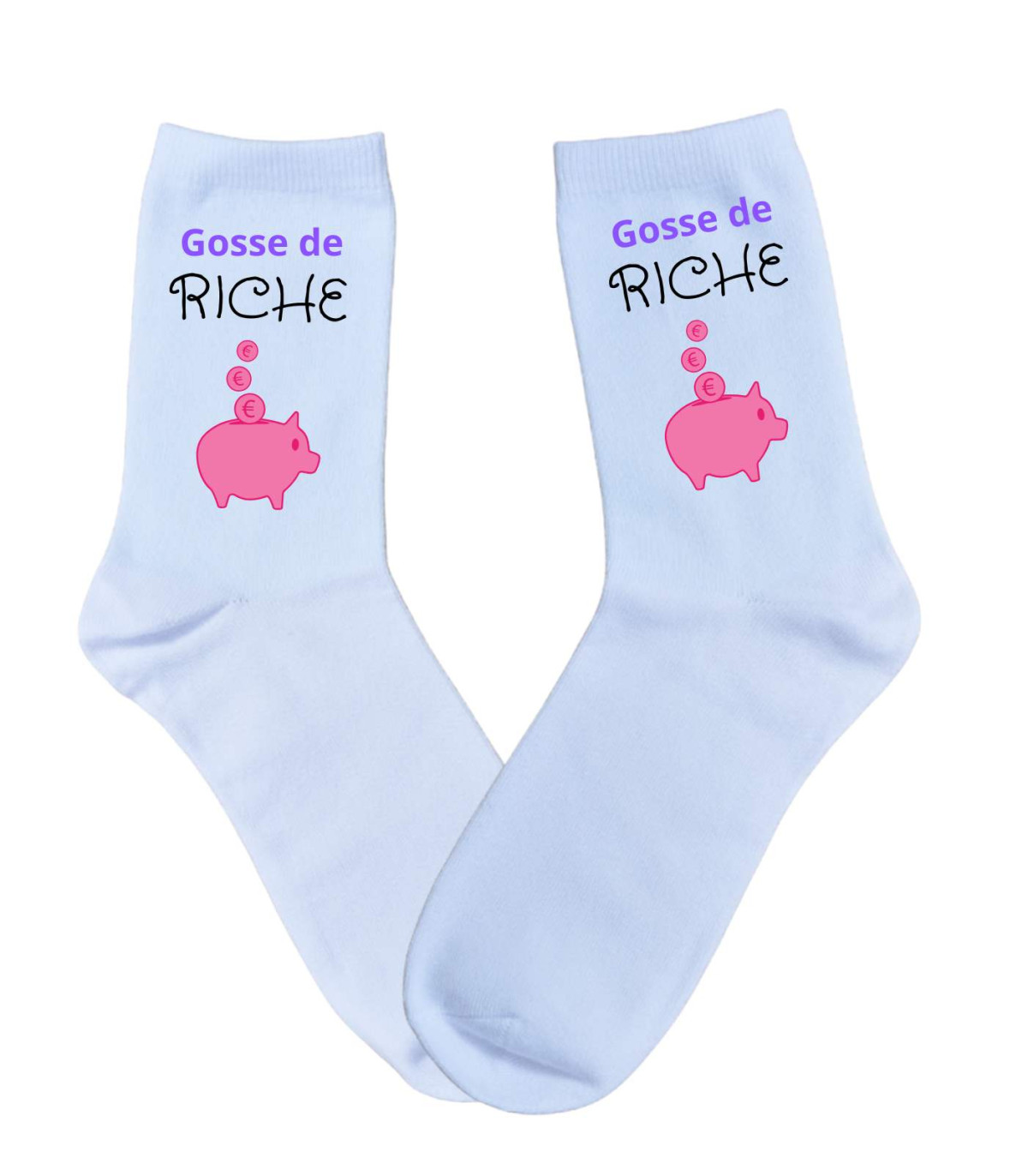 Le design est pensé pour être visible tout en restant élégant. Le texte "Gosse de Riche" est écrit avec une typographie moderne et dynamique, associant le violet et le noir pour un contraste parfait sur le fond blanc immaculé. L'illustration du cochon tirelire apporte ce côté "mignon" et ludique que l'on adore chez Camille. Portées avec un jean un peu court ou un bas de jogging, ces chaussettes deviennent la pièce maîtresse de votre tenue. Elles permettent d'exprimer votre personnalité avec légèreté.