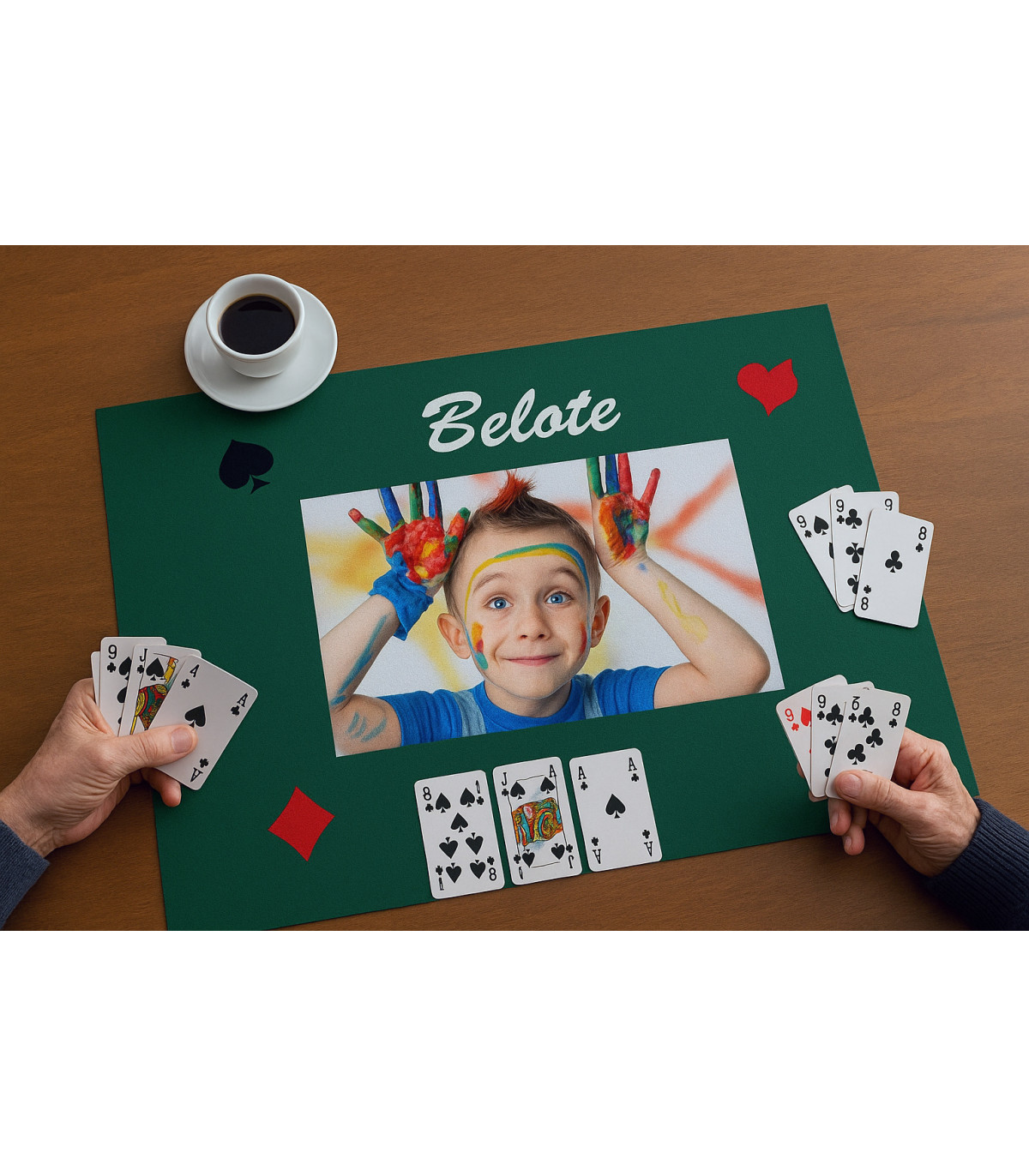 Tapis de jeu personnalisé avec photo : belote, tarot, poker. Pour tous vos jeux de dés et de cartes, un tapis format 35x45 ou 40x60 cms selon l'option choisie. Un très bel article pour jouer en famille.
