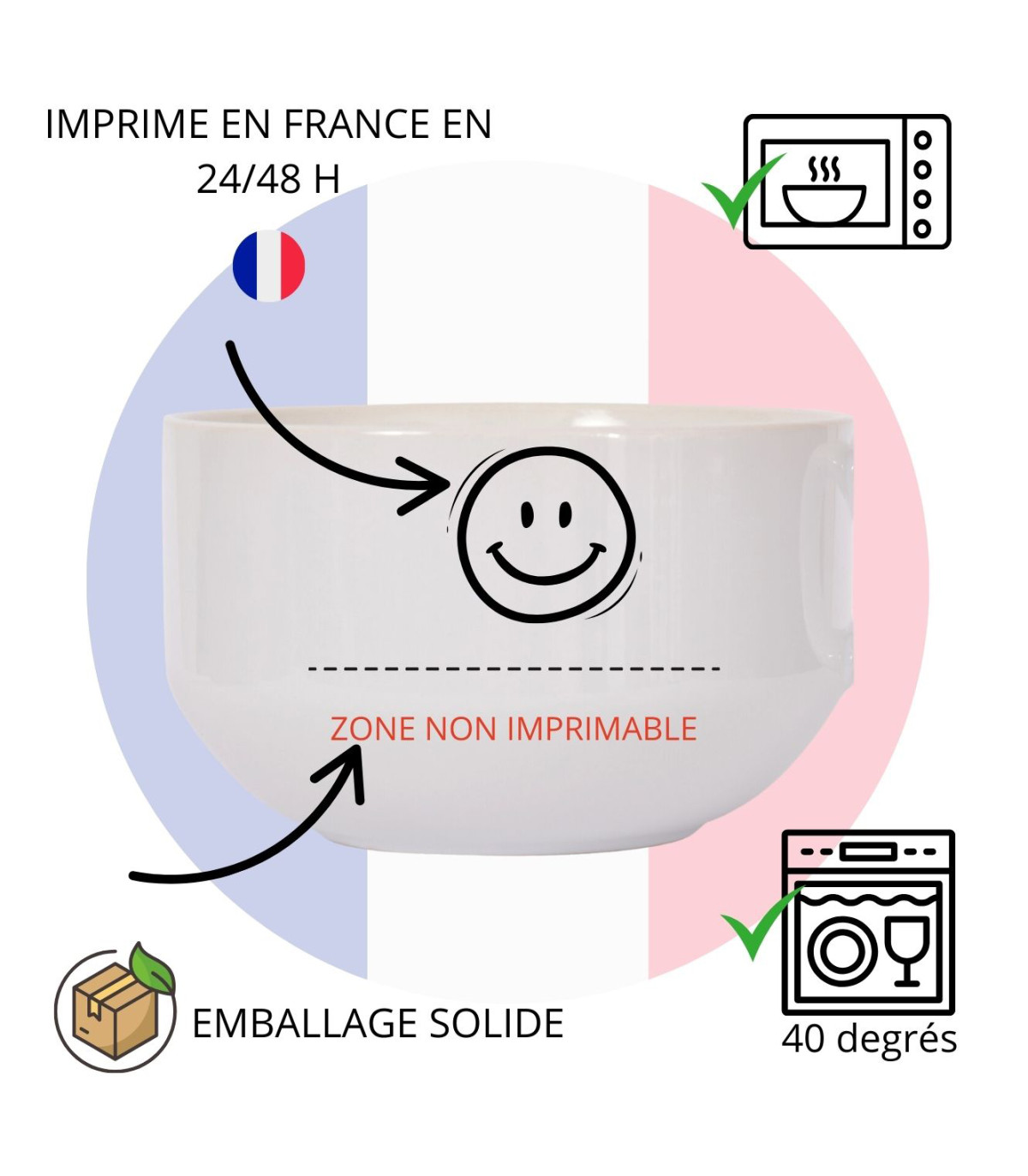 Notre bol est imprimé en France dans une céramique de grande qualité. Vous allez adorer sa solidité et il accepte sans problème le passage en micro ondes ou lave vaisselle. Par contre, le bol blanc n'aime pas les températures supérieures à 50 degrés, alors attention.