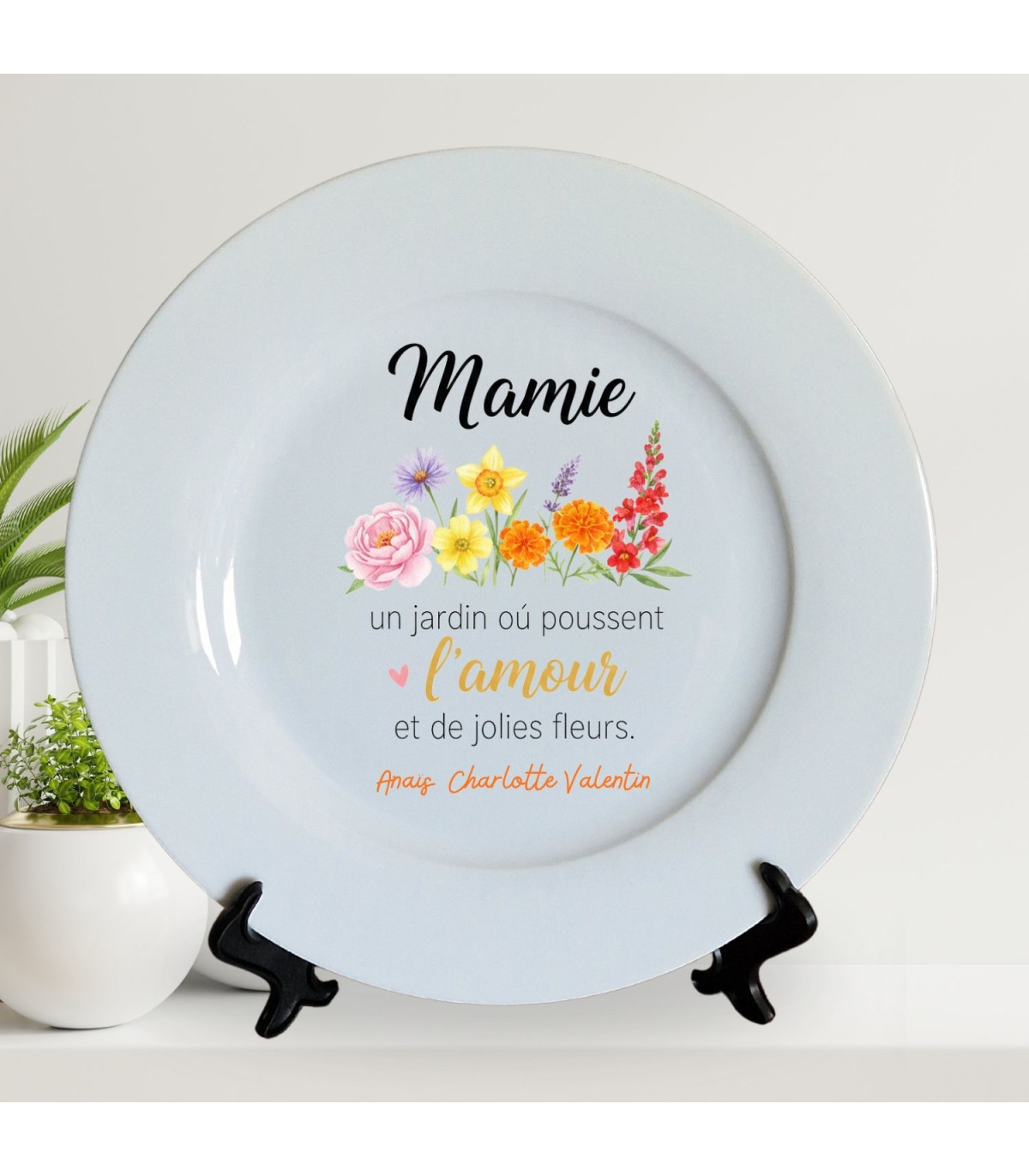 Véritable pièce maîtresse de décoration, notre assiette personnalisée "L'Herbier des Petits-Enfants" est une célébration de la vie et de la transmission. Arborant la douce métaphore "Mamie : un jardin où poussent l'amour et de jolies fleurs", cet objet d'art apporte une sérénité champêtre à son intérieur. C'est le présent idéal pour marquer les moments précieux de l'année, de la fête des grands-mères aux anniversaires les plus mémorables.