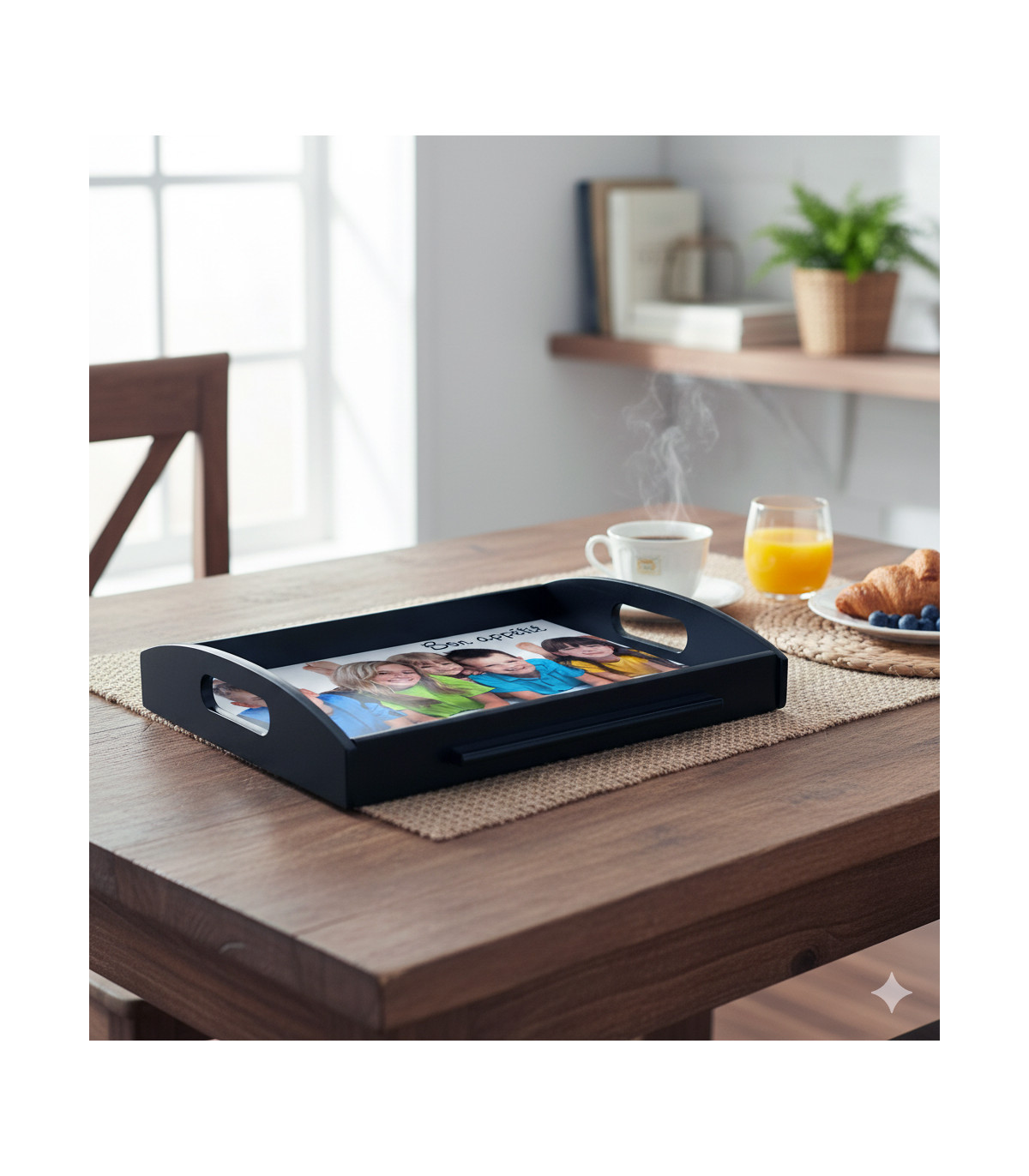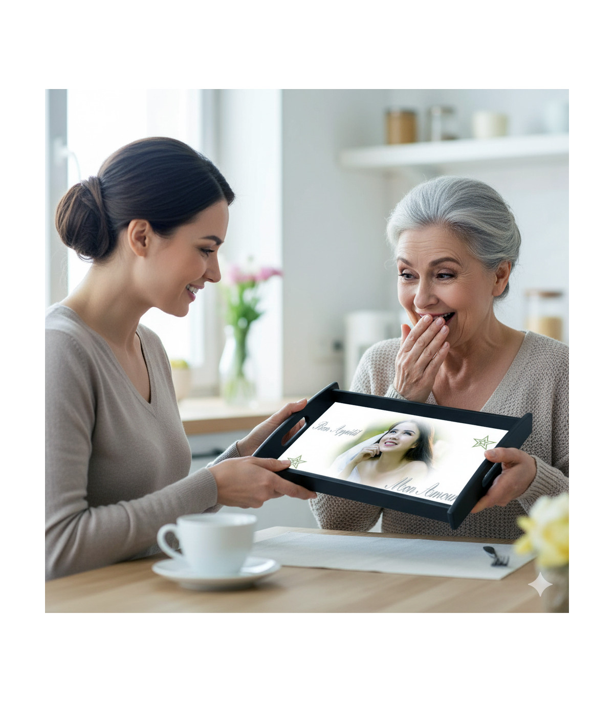 Ce qui rend ce plateau vraiment spécial, c'est que vous allez pouvoir le rendre unique avec votre photo préférée. Le fond noir laqué fait ressortir les couleurs de l'impression, assurant une excellente visibilité à votre image.