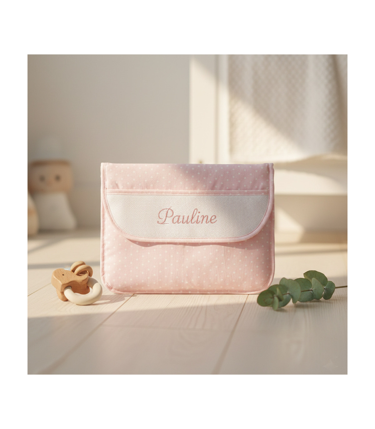 L’indispensable des jeunes parents : une pochette nomade en tissu doux, brodée au prénom de votre enfant pour ranger avec élégance ses produits de soin ou son carnet de santé. Un cadeau de naissance unique, utile et durable, décliné en trois coloris tendres.