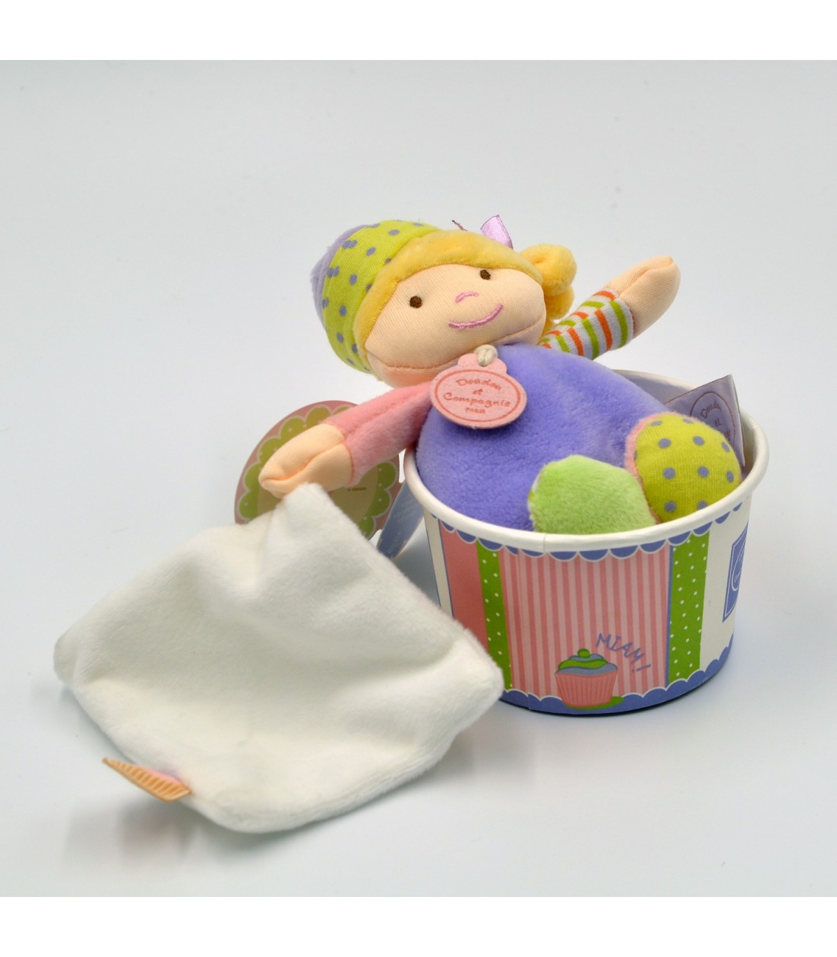Craquez pour cette adorable poupée Doudou et Compagnie, une véritable petite Fée des Rêves aux couleurs tendres (violet, rose et vert). Elle arrive dans sa superbe boîte cadeau en forme de cupcake "Miam", prête à faire un gros câlin à votre bébé !