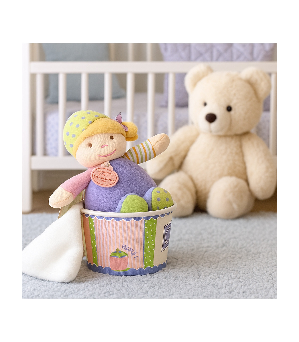 Présentation Cadeau : La poupée est nichée dans son joli pot en carton à motif cupcake, réutilisable et parfait pour offrir.