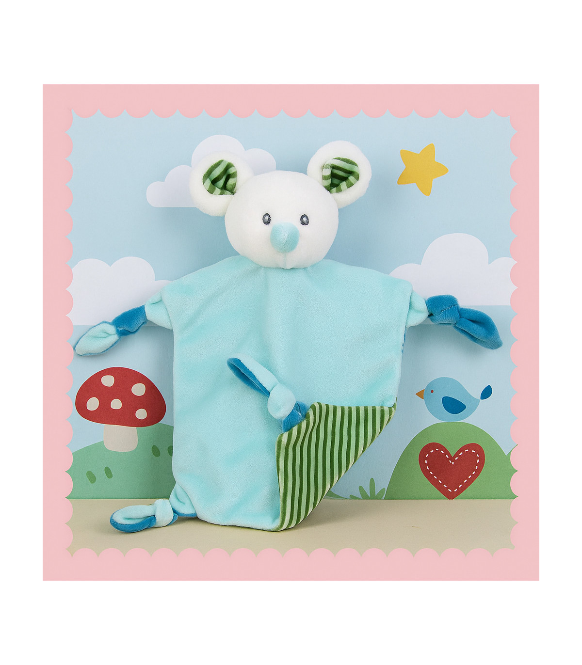 Cette petite souris ne fera peur à personne. Une souris doudou prénommée Louis toute habillée de bleu et de vert. Elle se personnalise en broderie...
