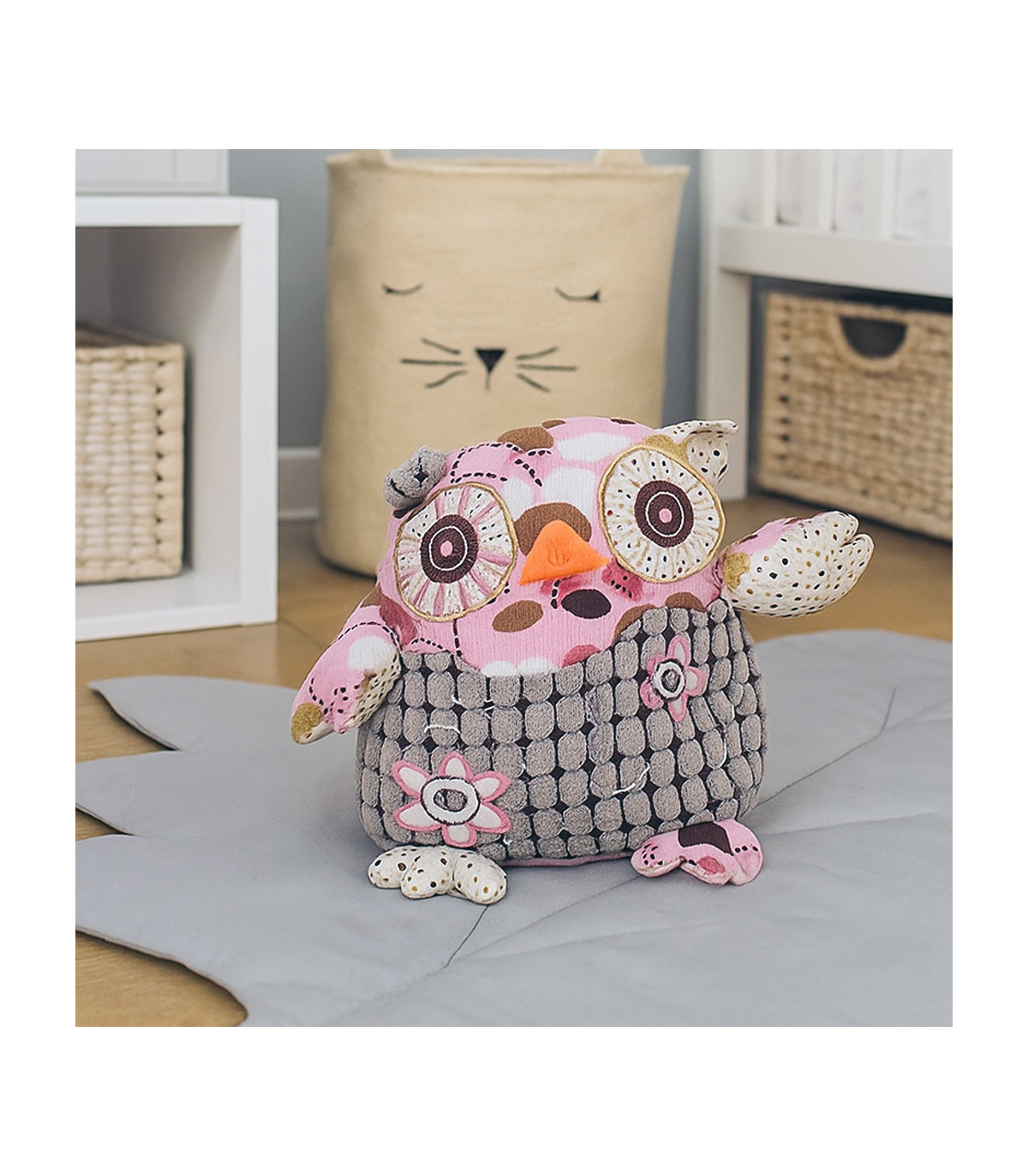 Craquez pour cette irrésistible peluche chouette de la marque allemande Inware. Avec ses couleurs originales et tendance – une alliance de rose, de gris texturé et de motifs fleuris – elle est bien plus qu'un simple doudou : c'est un adorable compagnon de jeu.