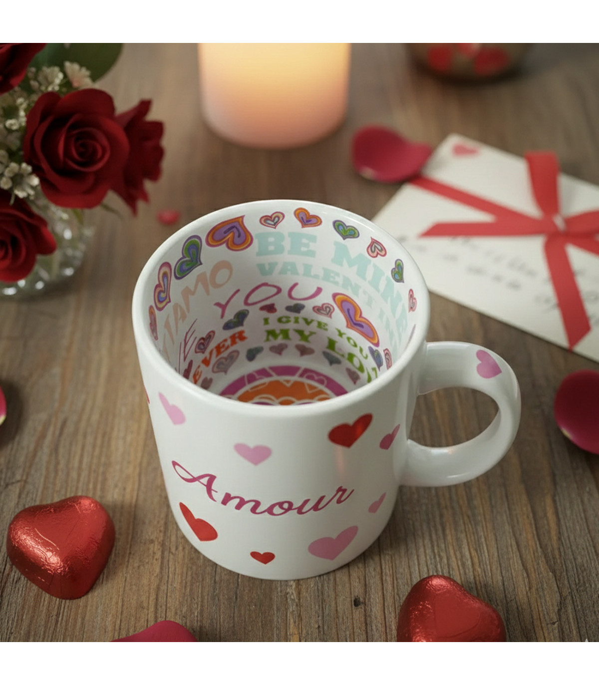 À chaque gorgée, votre partenaire découvrira une explosion de couleurs : le fond du mug est orné d'un magnifique motif de cœurs stylisés et du mot "LOVE". C'est le détail inattendu qui transforme une simple pause café en une véritable déclaration d'affection.